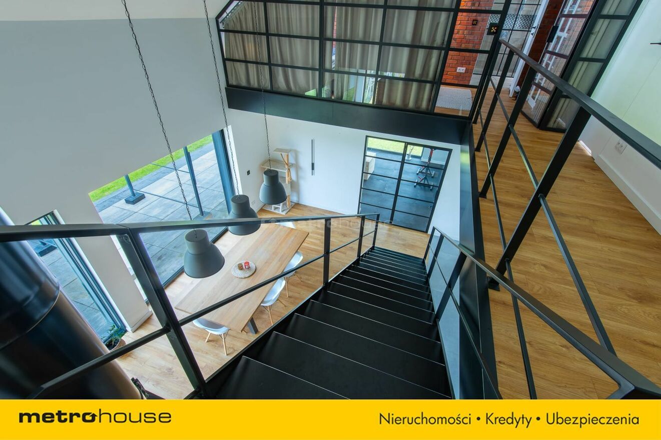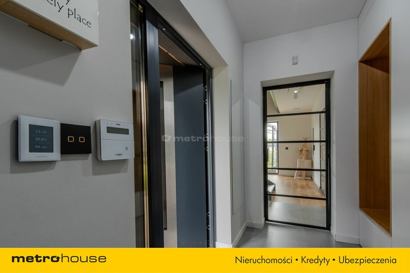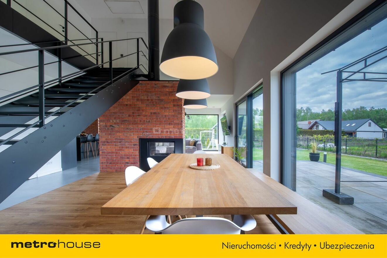 W całym domu zaprojektowano szafy w zabudowie stolarskiej – w przemyślany sposób poukrywano miejsca do przechowywania, jest osobne pomieszczenie na pralnio- suszarnię i spiżarnię, na piętrze 2 łazienki, garderoba przy sypialni, dużo przeszkleń, piękne schody, kominek otwarty na dwie strony, na tarasie aluminiowa pergola z zasłonami. Charakteru wnętrzu nadają bardzo oryginalne lampy i oświetlenie. Całość wykończona wysokiej jakości materiałami, dzięki temu przestrzeń wyjątkowo uporządkowana, spójna i niebywale elegancka, ale przy tym emanująca ciepłem i przytulnością.